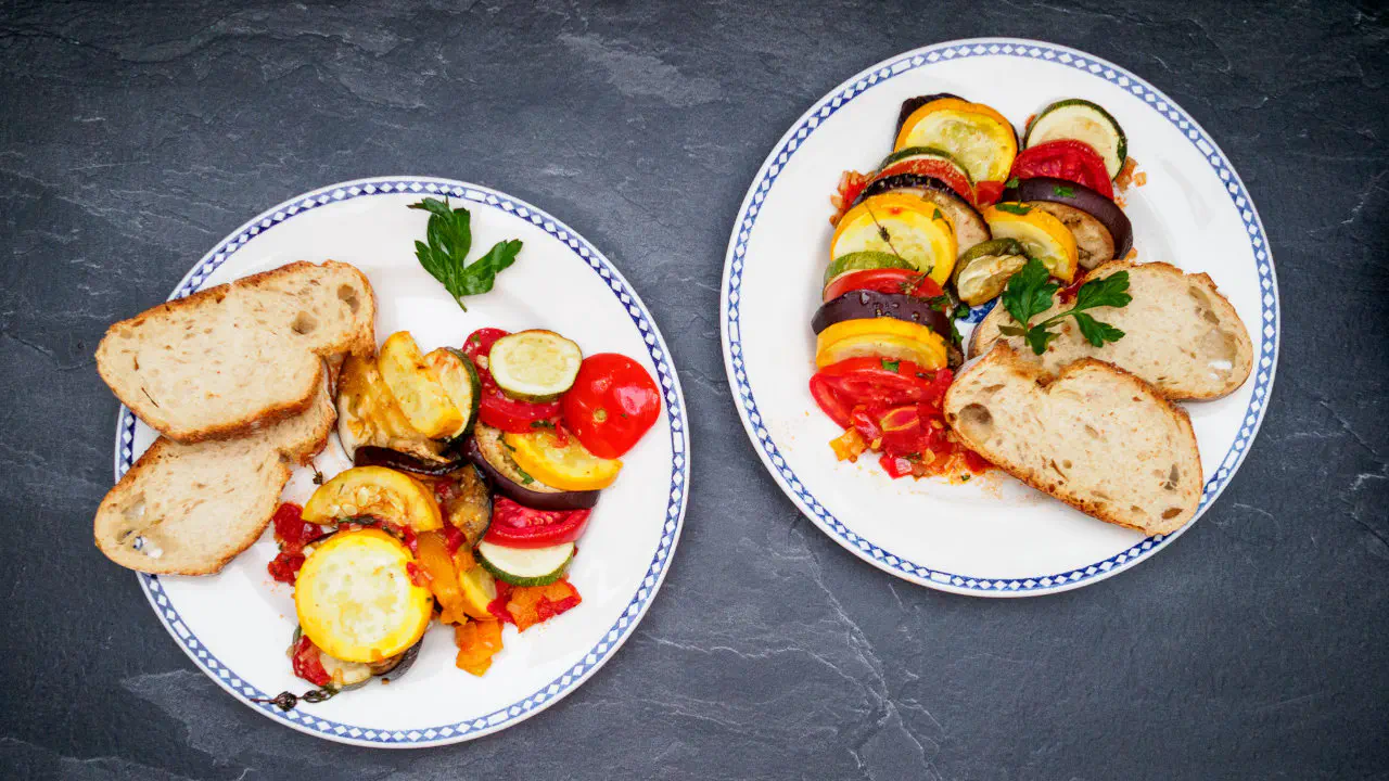 - Sauce in einer Auflaufform verteilen, Gemüsescheiben darauf schichten